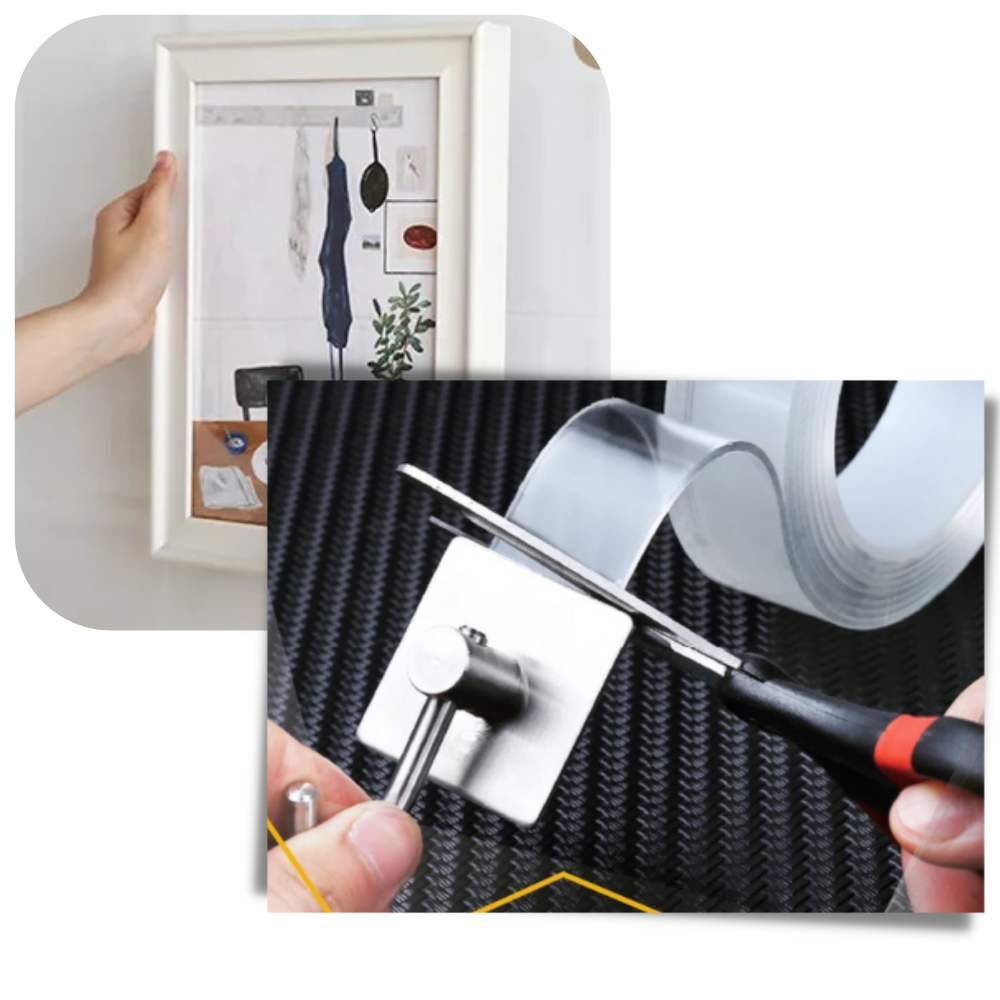 No more holes or cracks in your walls. The Magic Tape will help you put almost anything on the wall. Nanotechnology allows the tape to adjust to the object. So, whatever shape your object is the nano-tape will adjust to it. The adhesive will wrap around it and stick with extreme strength.