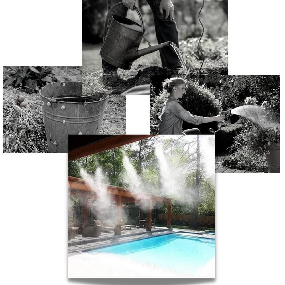 The sprinklers in this water system can be set to a misting or spraying mode. In this mode, water sprayed from the sprinklers is in the form of a fine mist. This helps the water go further than with traditional methods.